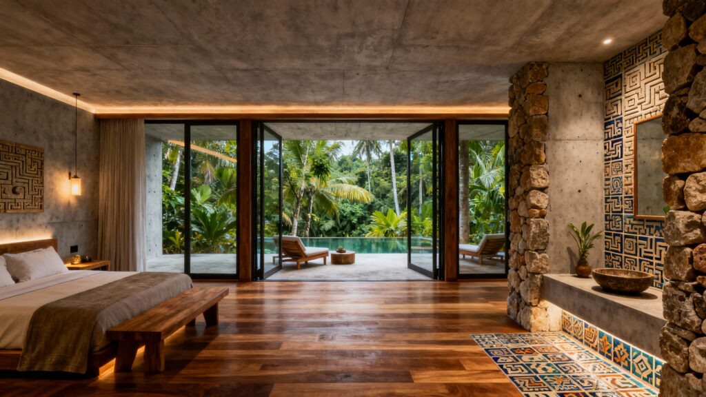 Think boutique hotel vibes. Use earthy tones, polished concrete, wood accents, and soft lighting. Add local artisan touches like Mayan tilework and tropical hardwoods to preserve authenticity while adding luxury.