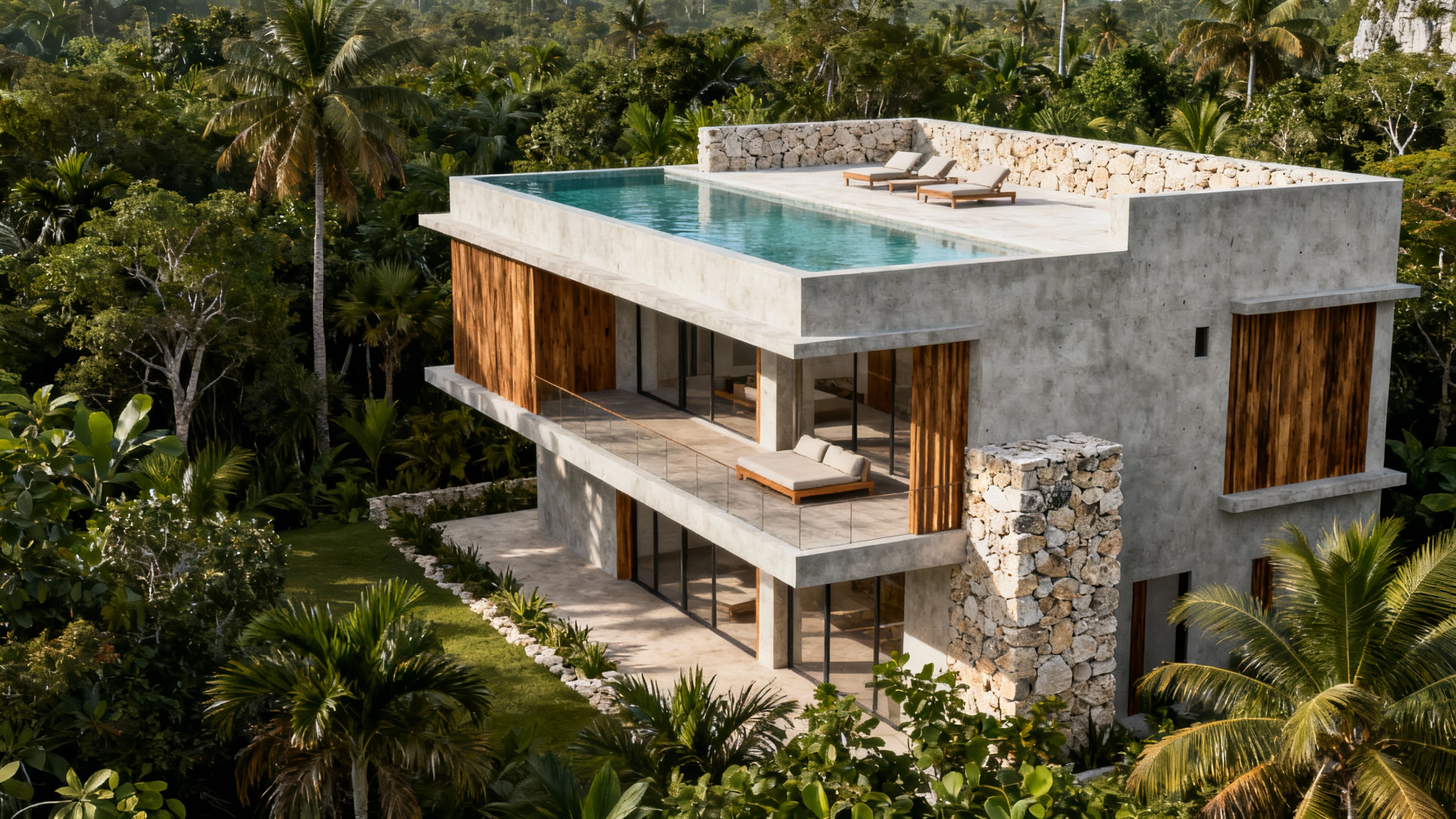 Modern Tulum-style villa with minimalist luxury design surrounded by jungle vegetation.