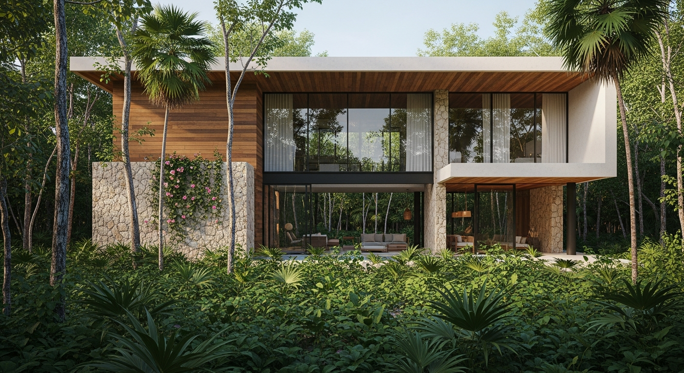 Eco-luxury modern home surrounded by jungle vegetation in Tulum or Akumal.